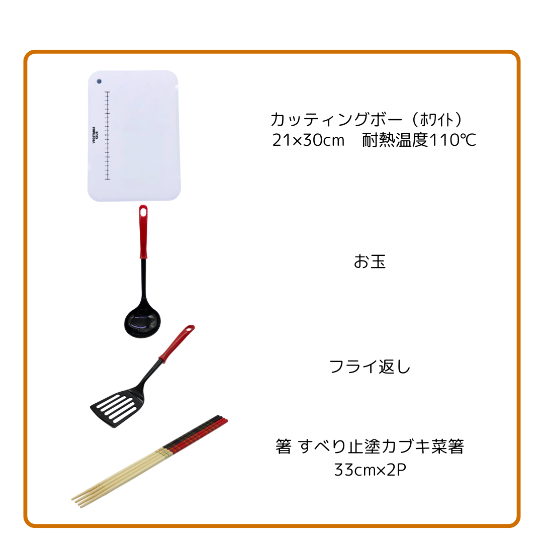 調理に必要なフライパンや鍋、便利なキッチンツール、清潔に保つためのスポンジや水切りネットまで、厳選したアイテムをセットにしました。